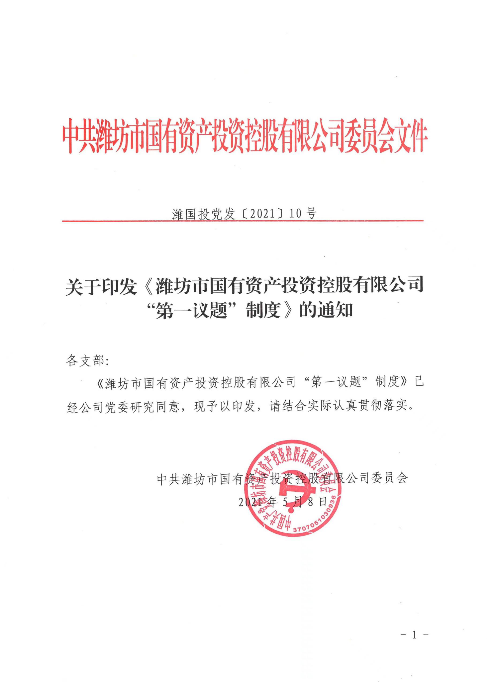 關(guān)于印發(fā)《濰坊市國有資產(chǎn)投資控股有限公司“第一議題”制定》的通知