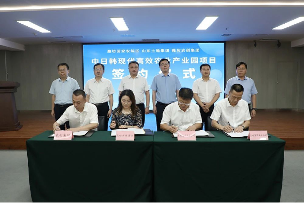 8月24日下午,中日韓現(xiàn)代高效農(nóng)業(yè)產(chǎn)業(yè)園國際高端果蔬種植基地項(xiàng)目簽約儀式在濰坊國家農(nóng)綜區(qū)總部基地舉行。濰坊國家農(nóng)綜區(qū)推進(jìn)辦常務(wù)副主任,濰坊經(jīng)濟(jì)開發(fā)區(qū)(農(nóng)綜區(qū)核心區(qū))黨工委副書記、管委會主任喬日升;山東省土地發(fā)展集團(tuán)威海有限公司董事長、總經(jīng)理李強(qiáng),濰坊有限公司董事長、總經(jīng)理鄭偉;濰坊農(nóng)創(chuàng)集團(tuán)黨委書記、董事長王保梁出席簽約儀式并致辭。濰坊農(nóng)創(chuàng)集團(tuán)黨委副書記、總經(jīng)理付華東主持簽約儀式。